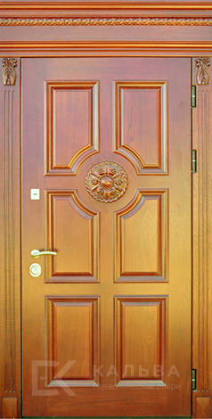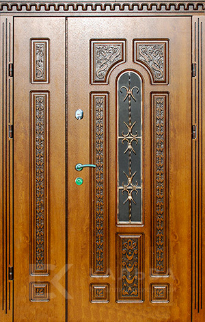 Фото «Стальная двустворчатая дверь под орех со стеклом и ковкой №105»